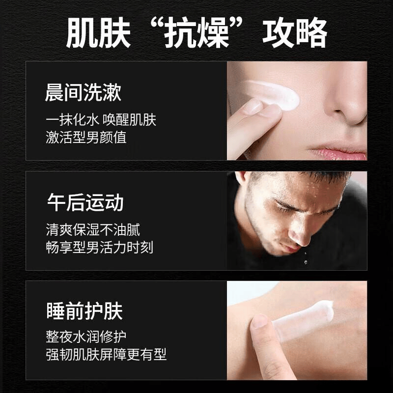除了日常护肤外,这款护肤品在晒后修复和换季时也表现出色,帮助肌肤对抗外界环境带来的压力。同时,添加的深海矿物盐和植物萃取成分,为肌肤建立起天然保护膜,增强抵御能力,让肌肤更健康和强韧,完全满足现代男士的护肤需求。